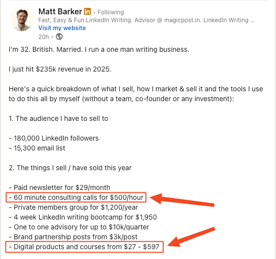 For example, if you look at Matt Barker, a prominent copywriter on LinkedIn, you can see that he’s spread his expertise into multiple offerings. This spread of offerings has helped him make $235k revenue so far in 2025