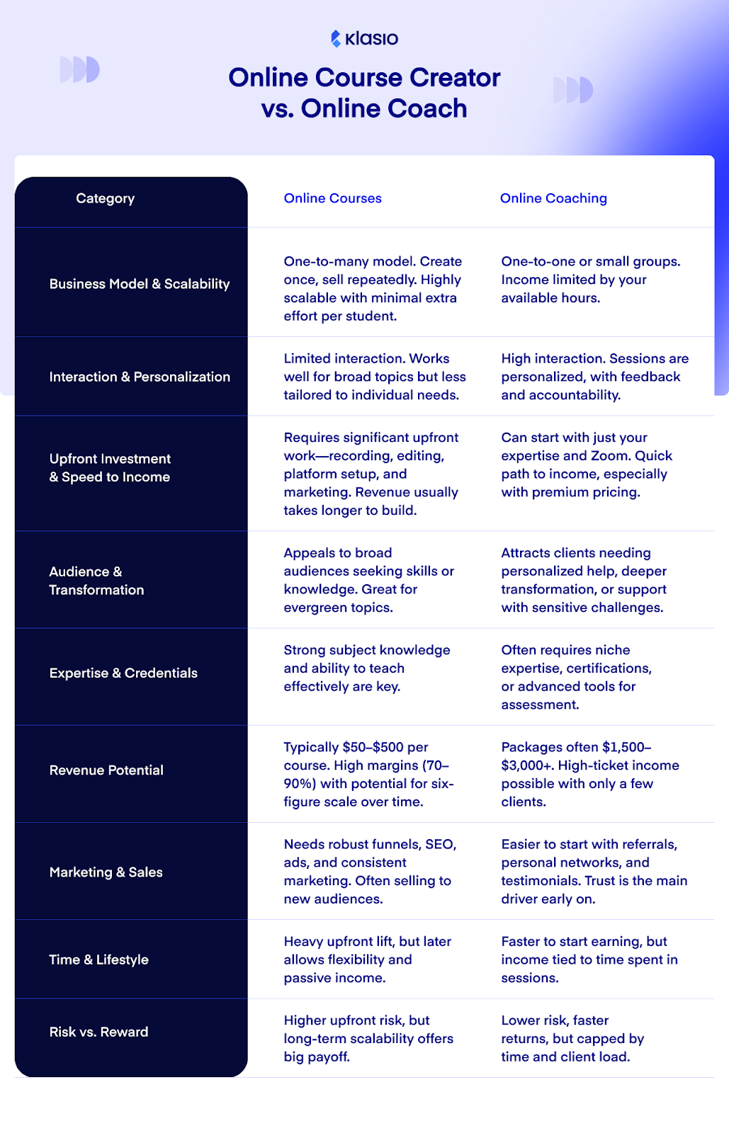 - If you’re just starting out or don’t have a big audience yet, coaching often gets you to revenue faster. Since you’re working directly with clients, you can charge premium prices, get feedback immediately, and build credibility along the way.