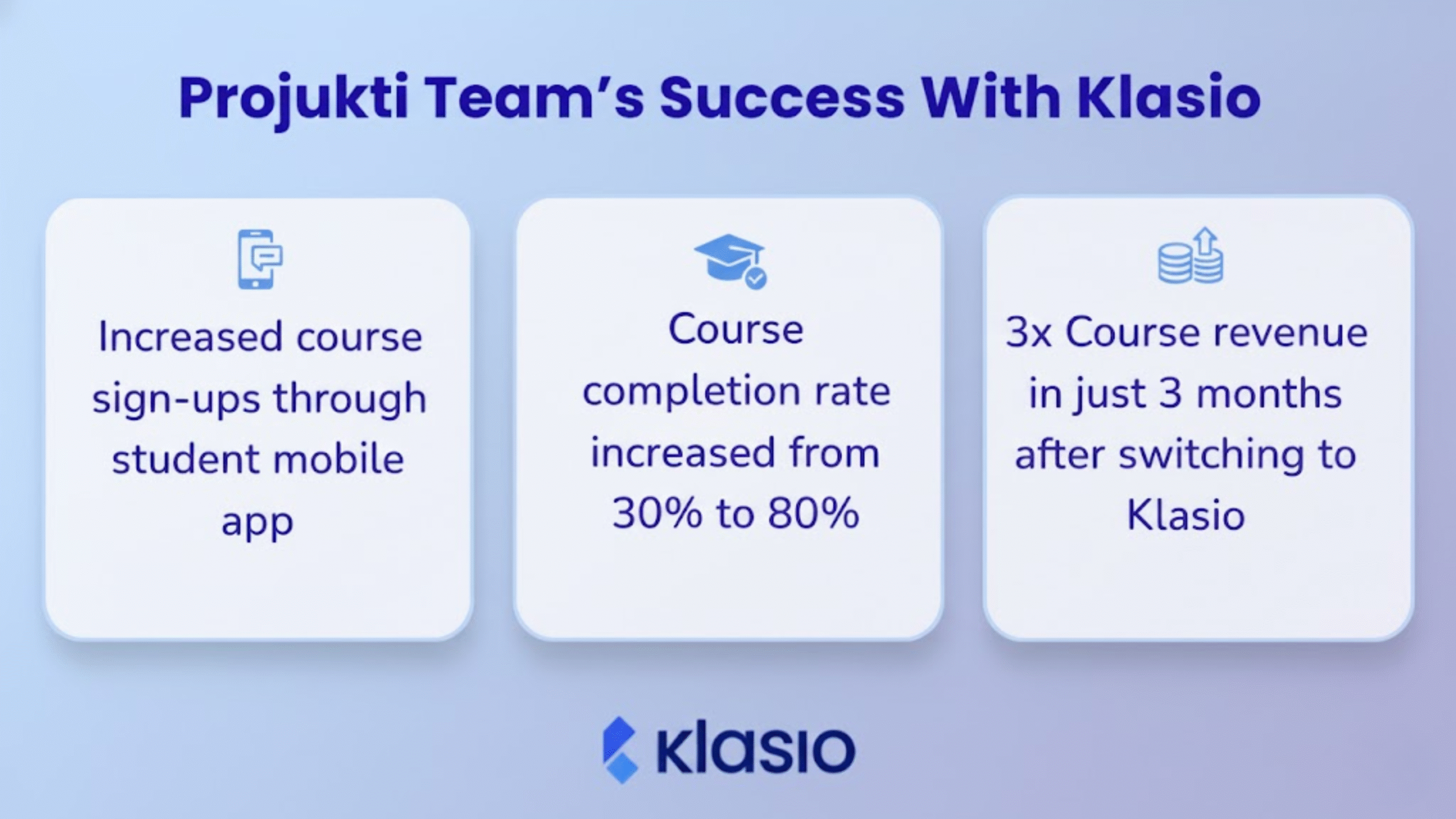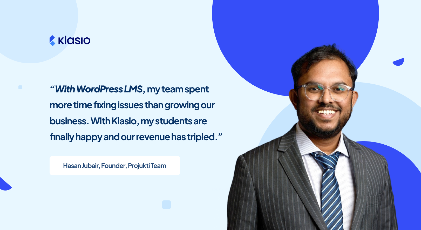 What sealed the deal was Klasio’s clean, intuitive student interface. No complex navigation. No plugin management. Just a straightforward learning journey across both desktop and mobile. Ever since Hasan moved from a WordPress LMS to Klasio, his students have been very happy because of the mobile app. Course completion rate has increased from 30-40% to 75-80%.