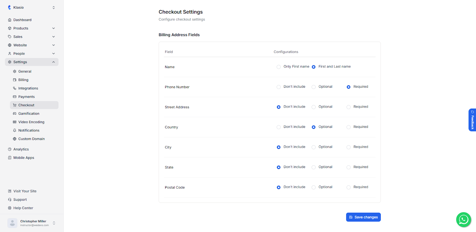 You now have granular control over the billing information collected during checkout. This new feature allows you to configure which billing address fields are included, made optional, or required. As a result, you have the flexibility to comply with regional tax regulations or simply streamline the checkout process for your students.