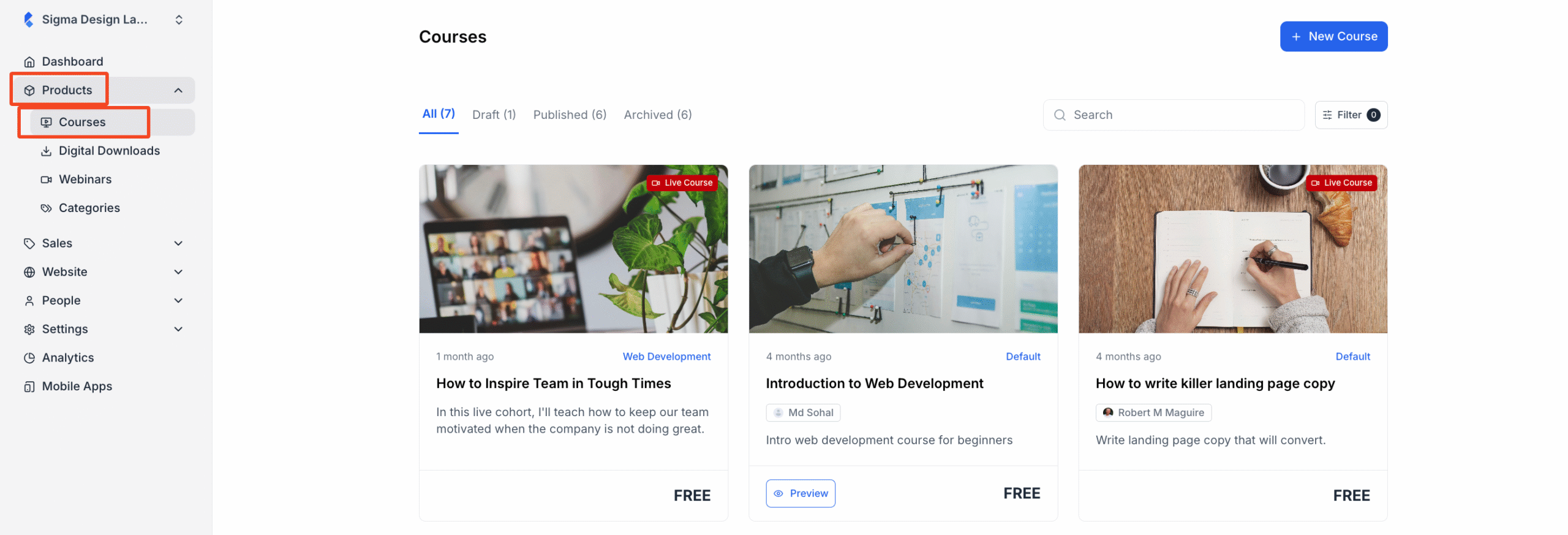 1. From the dashboard, click on Products > Courses. Then choose the course you want to add the lesson to.