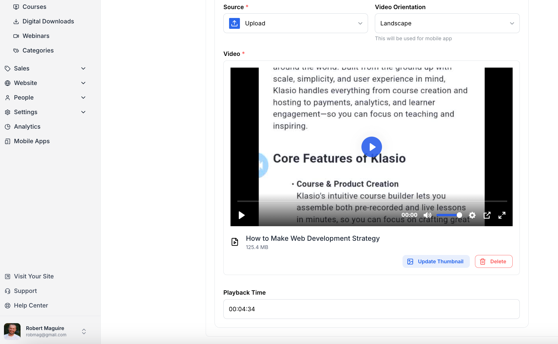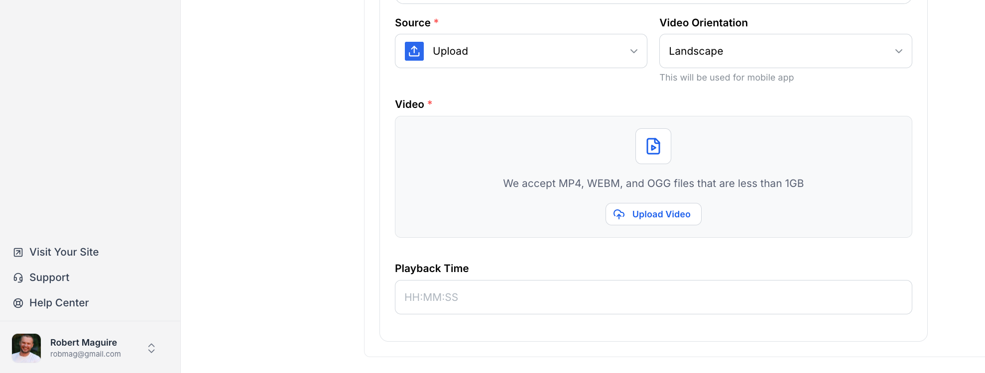 6. Once you’re done uploading, you can select the orientation of the video using the video orientation dropdown. This is for the mobile users. Also, from the playback time field, you can see the total runtime of the video.