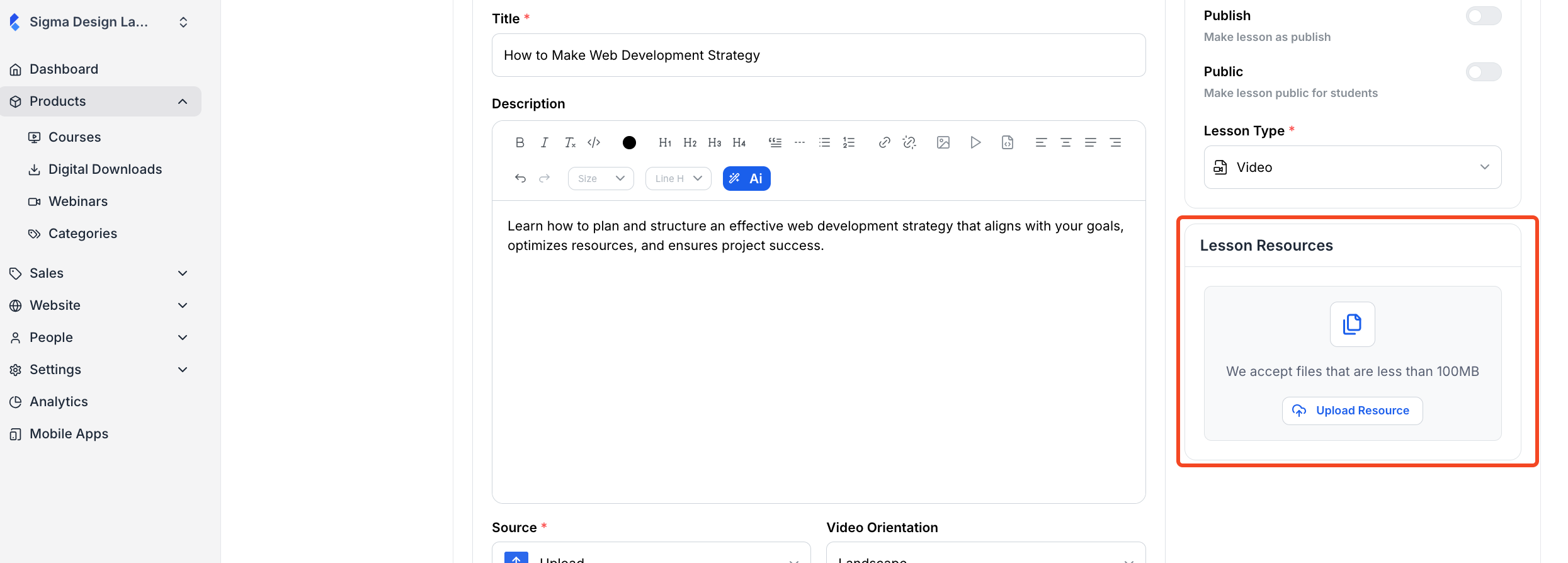 7. Next, if you want to add any additional resources, such as PDFs or Docs relevant to the lesson, you can add them by clicking on the ‘Upload Resource’ button. The maximum size for the file is 100MB.