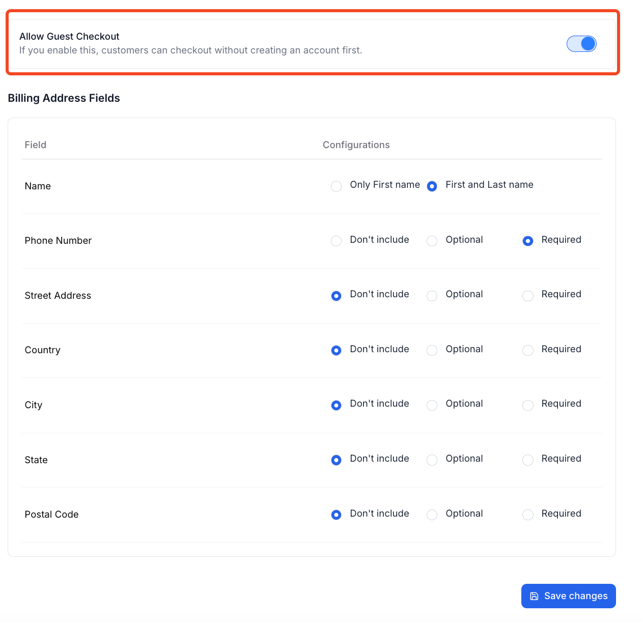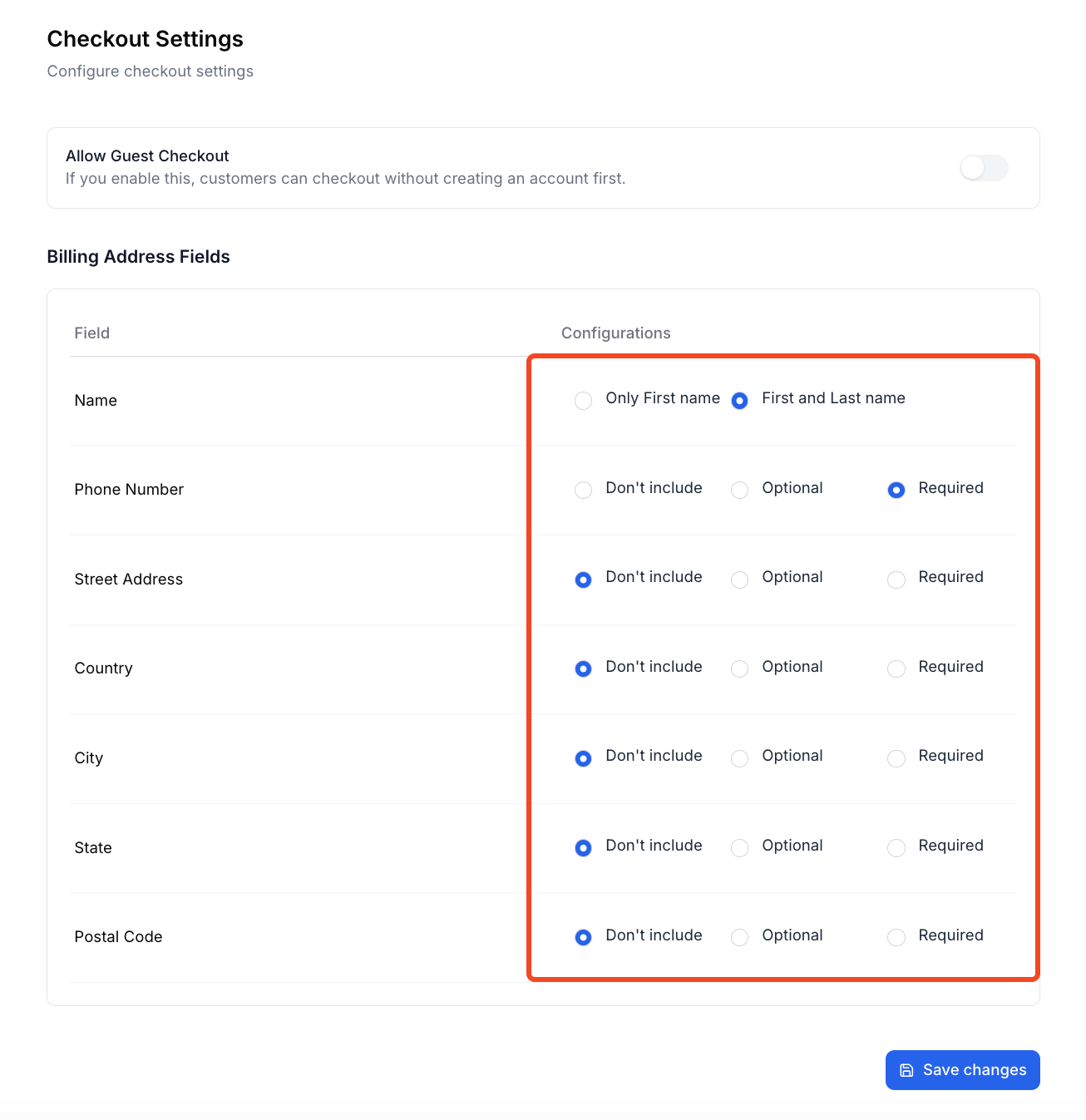 3. The rest of the options, you can choose not to include, keep them optional, or make them mandatory. Customize your checkout form as you see fit. As for our example, we will keep the Name and Phone Number mandatory and will not include the rest of the fields. Then, we click on the “Save Changes” button to save the changes.