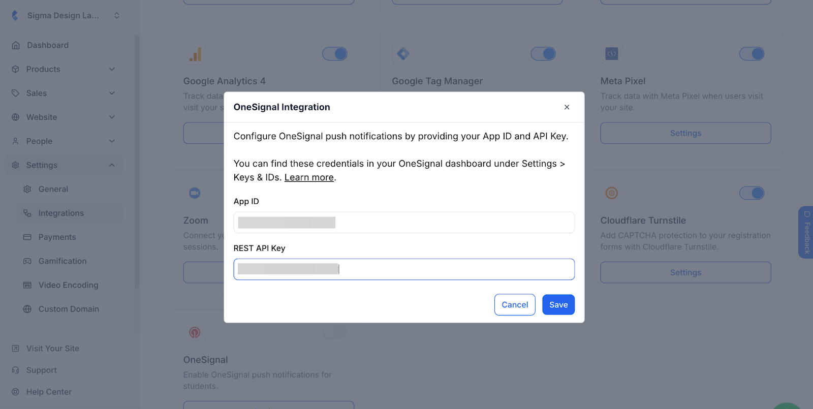 Here you’ll be asked to insert your One Signal App ID and REST API Key.